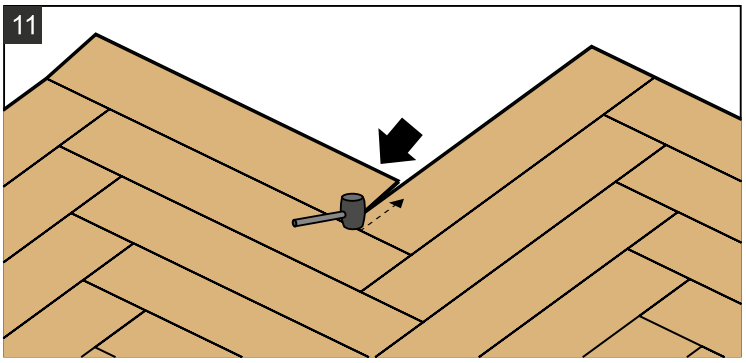12.1. Продолжайте монтаж плашек, соединяя замки под углом с помощью системы Click System 5-го поколения.Тщательно проверяйте стыки между плашками на отсутствие зазоров после добавления каждой следующей. При необходимости подбивайте плашки при помощи киянки и подбойника. Работайте по направлению от угла к концу плашки по короткой стороне (рис. 11).