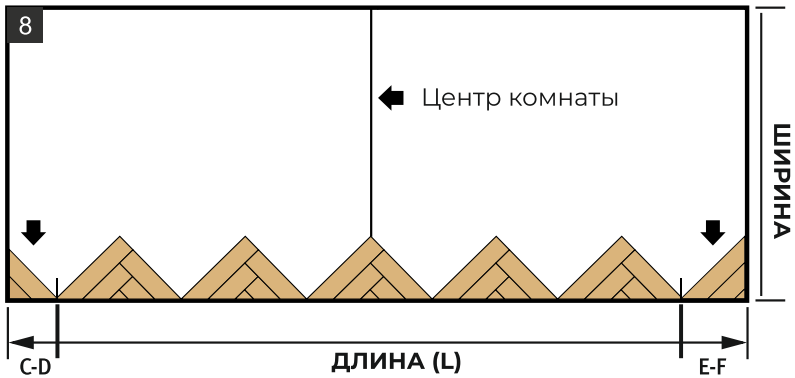 11.1. Разложите треугольники длинной стороной к стартовой стене, выравнивая их относительно центра комнаты и боковых стен. Отпилите расстояния C-D и E-F от оставшегося треугольника (треугольников) и установите их (рис. 8).