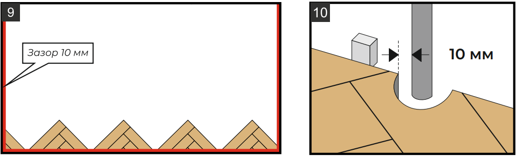 11.2. Укладывайте плашки с учетом зазоров 10 мм (рис. 9-10) от всех стен и иных неподвижных сквозных конструкций (труб, дверных ограничителей, внутрипольных конвекторов и др.).