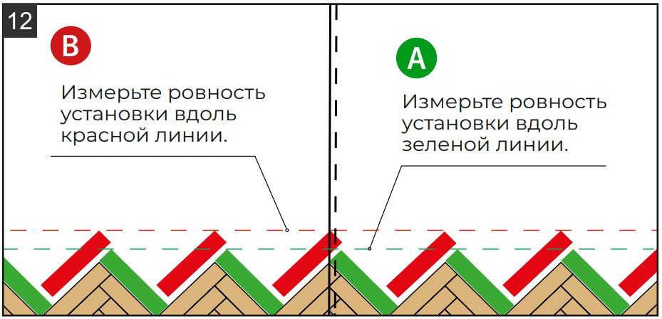 12.2. Установите плашки «А», как показано на рисунке 12. Тщательно проверьте стык между плашкой «A» и треугольником. Не должно быть никаких выступающих краёв и зазоров! Отрежьте левый край так, чтобы он соответствовал размеру помещения с учетом зазора для расширения 10 мм.