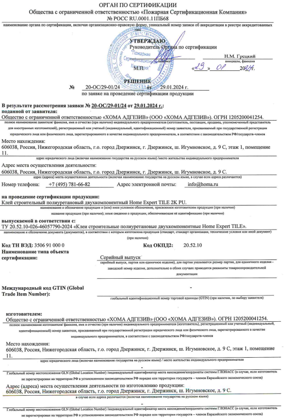 Решение о сертификации Home Expert TILE 2K PU