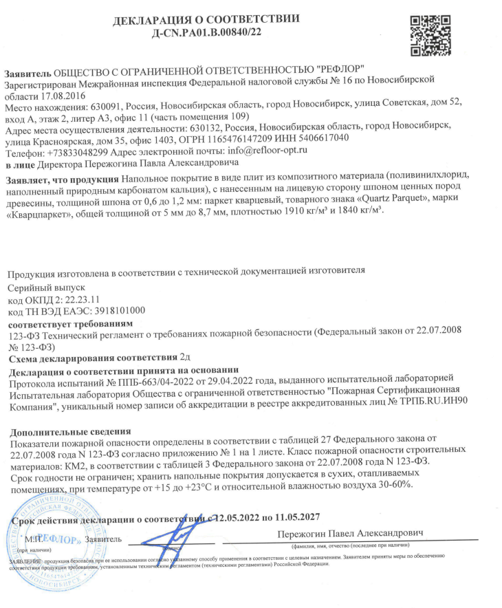 Декларация о соответствии Quartz Parquet